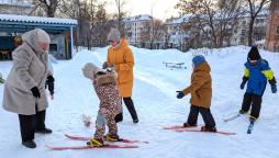 ... вместе с гостями: Уральским медведем и Северным оленем, дети и взрослые выполнили весёлую разминку, дошкольники прошли символическую дистанцию на лыжах и мини-лыжах, а малыши вместе с папами и мамами проехали на санках-колясках...